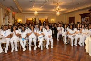The ceremony then welcomed keynote speaker Dr. Keisha Wisdom, Senior Vice President and Chief Nursing Officer at St. John’s Episcopal Hospital. Dr. Wisdom, drawing on her own memories of her pinning day, shared a heartfelt story about revisiting those early moments that morning. Inspired by a wave of nostalgia and pride, she revised her speech to speak directly to Cohort 5. She reminded the graduates that their pins represent more than just badges: they are, in her words, “profound symbols signifying your formal entry into the noblest of professions as nurses.”