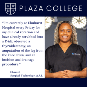 Meet Chantel, a dedicated student in Plaza College’s Surgical Technology program. After earning her AAS Degree in Medical Assisting from Plaza College in 2016, Chantel decided to continue building upon her healthcare education and pursue a career in Surgical Technology. Growing up in a family of healthcare professionals, she always knew this was the right path for her.